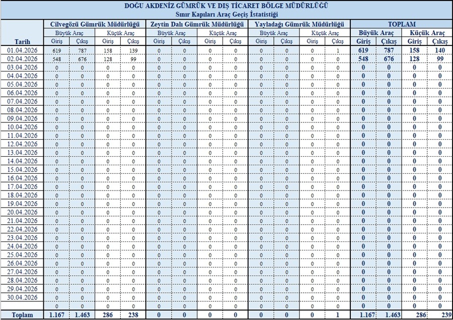 Bölge Müdürlüğümüze Bağlı Kara Hudut Kapılarından Geçiş Yapan Araç Sayıları;